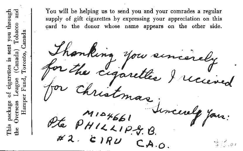 You will be helping us to send you and your comrades a regular supply of gift cigarettes by expressing your appreciation on this card to the donor whose name appears on the other side. |